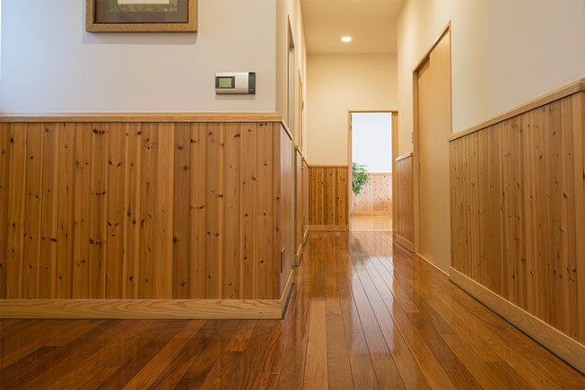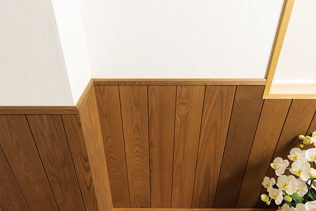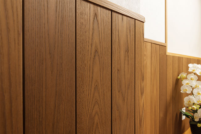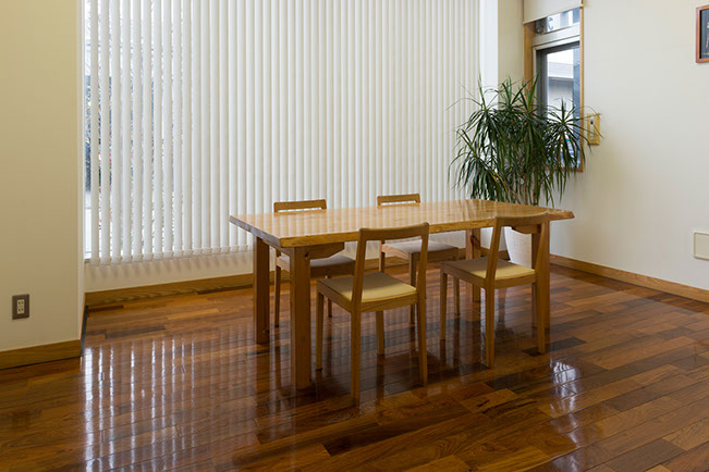 北米が原産の丈夫なホワイトアッシュに、特殊な熱を深部まで加えることにより、乾燥や湿気による寸法の変化を抑えています。着色では得られない落ち着きのある自然な風合いは、住む人に安らぎをあたえます。