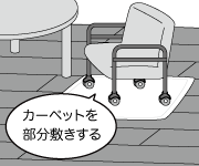 机・テーブル・椅子などの脚には保護キャップをかぶせてください。ピアノなどの重量物は敷板を介して設置してください。荷重のかかった状態のままキャスター付きの椅子やワゴンを動かすと傷になる場合があります。カーペットなどで床面を保護してご使用ください。