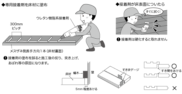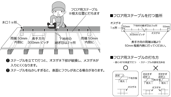 ●施工はかならず床材用の糊と釘を併用してください。