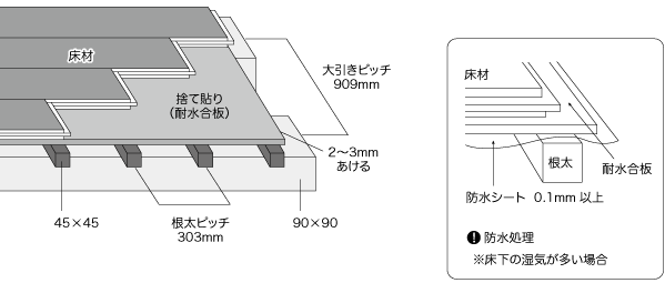 ●かならず捨て貼りをします。捨て貼り合板は12mm以上の耐水合板を使用してください。